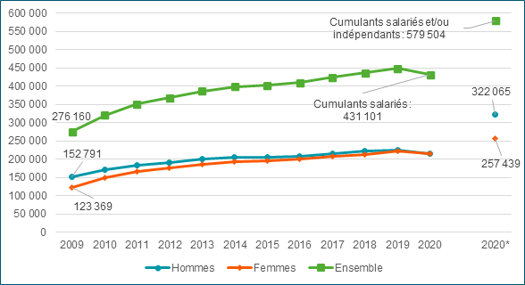 Depuis 2020, les salariés du secteur privé et les travailleurs indépendants sont regroupés dans le régime général de retraite. En 2020, environ 580 000 personnes bénéficiaient du cumul emploi-retraite, dont 157 126 étaient des travailleurs indépendants et 431 101 étaient des salariés du privé. Parmi eux, 8 700 personnes exerçaient à la fois une activité salariée et une activité indépendante.